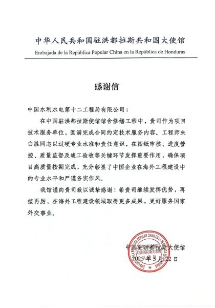 近日,中國駐洪都拉斯大使館發(fā)來表揚(yáng)信,對公司在使館館舍修繕工程中取得的成績表示肯定。 表揚(yáng)信指出,作為中國駐洪都拉斯大使館館舍修繕工程項(xiàng)目的技術(shù)服務(wù)單位,水電十二局圓滿完成合同約定技術(shù)服務(wù)內(nèi)容,工程師朱白勝同志以過硬的專業(yè)水準(zhǔn)和責(zé)任意識,在圖紙審核、進(jìn)度管控、質(zhì)量監(jiān)督和竣工驗(yàn)收等關(guān)鍵環(huán)節(jié)發(fā)揮了重要的作用,確保項(xiàng)目高質(zhì)量按期完成,充分彰顯了中國企業(yè)在海外工程建設(shè)中的專業(yè)水平和嚴(yán)謹(jǐn)務(wù)實(shí)的作風(fēng)。 后續(xù),美洲區(qū)域總部/美洲公司將持續(xù)發(fā)揚(yáng)拼搏奮進(jìn)的精神,乘勝而上、擔(dān)當(dāng)作為,積極搶抓高質(zhì)量訂單,為公司高質(zhì)量發(fā)展貢獻(xiàn)力量。
