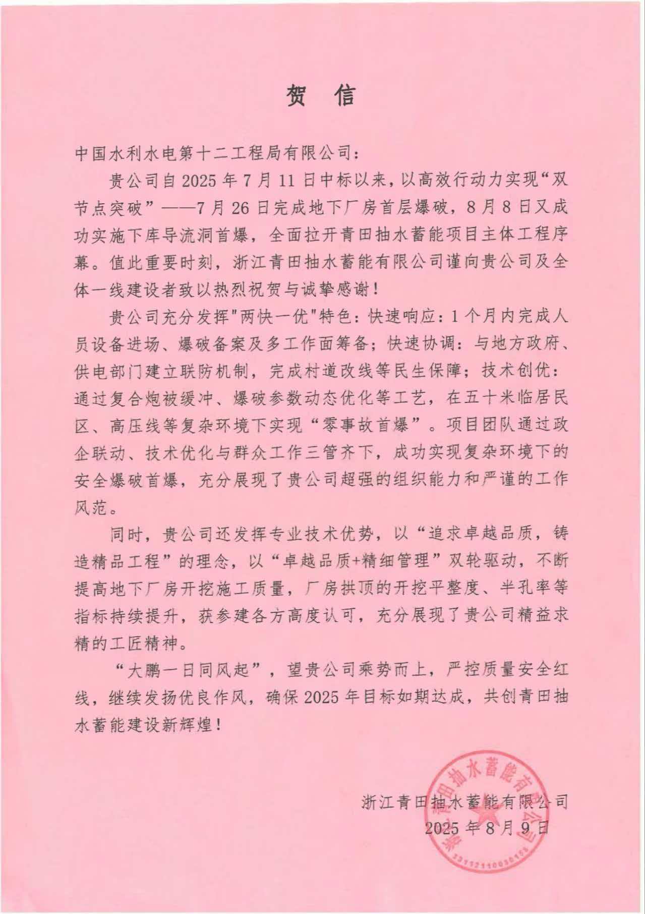 11月20日,浙南群山間,隨著最后一茬爆破的轟鳴聲精準(zhǔn)落定,巖渣清運(yùn)工作有序收尾,由中國水利水電第十二工程局有限公司承建的浙江青田抽水蓄能電站地下廠房工程迎來里程碑式突破—主副廠房第Ⅰ層開挖較合同計(jì)劃提前42天全面完成! 這一關(guān)鍵節(jié)點(diǎn)的超前實(shí)現(xiàn),不僅標(biāo)志著電站建設(shè)從“地下攻堅(jiān)”階段正式邁入“結(jié)構(gòu)成型”新階段,更以實(shí)打?qū)嵉?ldquo;十二局速度”為電站首臺(tái)機(jī)組發(fā)電目標(biāo)筑牢根基,盡顯水電十二局在抽水蓄能領(lǐng)域深耕多年的專業(yè)實(shí)力與央企品牌擔(dān)當(dāng)。 浙江青田抽水蓄能電站是浙江省“十四五”能源發(fā)展規(guī)劃的重點(diǎn)項(xiàng)目,更是全省“千項(xiàng)萬億”工程的重要組成部分,承載著國家能源戰(zhàn)略與區(qū)域發(fā)展使命。電站建成投運(yùn)后,將主要承擔(dān)華東電網(wǎng)調(diào)峰、填谷、調(diào)頻、調(diào)相及緊急事故備用等核心任務(wù),成為區(qū)域電網(wǎng)安全穩(wěn)定運(yùn)行的“穩(wěn)定器”,以及風(fēng)電、光伏等新能源消納的“調(diào)節(jié)器”,為浙江省能源結(jié)構(gòu)向清潔化、低碳化轉(zhuǎn)型,如期實(shí)現(xiàn)“雙碳”目標(biāo)提供硬核支撐。 高效履約跑出建設(shè)“加速度” 浙江青田抽水蓄能電站項(xiàng)目依托中國電建聯(lián)合體推進(jìn),致力于將項(xiàng)目打造為抽水蓄能電站EPC總承包模式的典范工程。作為國家一等大(1)型工程,青田抽蓄電站總裝機(jī)1200兆瓦,樞紐含上下水庫、輸水系統(tǒng)、地下廠房等建筑,其中上水庫正常蓄水位560米、死水位524米,下水庫正常蓄水位112米、死水位84米,上下水庫調(diào)節(jié)庫容均達(dá)929萬立方米,具備高效的日調(diào)節(jié)能力。 2025年7月,水電十二局中標(biāo)青田抽蓄電站地下廠房工程,隨即以“時(shí)不我待、只爭朝夕”的勁頭迅速進(jìn)入戰(zhàn)斗狀態(tài)。中標(biāo)僅一個(gè)月時(shí)間,項(xiàng)目團(tuán)隊(duì)便完成了人員設(shè)備調(diào)集、爆破備案及多工作面籌備等全流程前期工作,用高效的組織能力為工程開工按下“快進(jìn)鍵”。 7月26日,地下廠房“鏡面爆破”成功實(shí)施,實(shí)現(xiàn)“首爆即優(yōu)、起步即標(biāo)桿”;8月8日,下庫導(dǎo)流洞首爆順利完成,全面拉開主體工程建設(shè)序幕—短短十余天內(nèi)實(shí)現(xiàn)“雙節(jié)點(diǎn)突破”,這一亮眼成績不僅讓業(yè)主單位浙江青田抽水蓄能有限公司專門發(fā)來賀信點(diǎn)贊,更印證了水電十二局“快速響應(yīng)、快速協(xié)調(diào)、技術(shù)創(chuàng)優(yōu)”的“兩快一優(yōu)”特色。 面對(duì)長178米、寬24.5米、高58.85米的巨型地下洞室開挖任務(wù),項(xiàng)目部始終堅(jiān)守“安全為先、質(zhì)量為本、效率為要”的原則,創(chuàng)新采用“中導(dǎo)洞先行、兩側(cè)分層擴(kuò)挖”的精細(xì)化工法,配套投入三臂鑿巖臺(tái)車、濕噴機(jī)械手等先進(jìn)施工裝備,構(gòu)建起“科學(xué)決策-高效執(zhí)行-全程監(jiān)督”的管理閉環(huán)。 從爆破參數(shù)的精準(zhǔn)測算,到巖渣清運(yùn)的有序調(diào)度,再到各工作面的協(xié)同配合,每一個(gè)環(huán)節(jié)都做到環(huán)環(huán)相扣、無縫銜接,最終實(shí)現(xiàn)主副廠房第Ⅰ層開挖提前42天完工,將“十二局速度”鐫刻在青田抽蓄的建設(shè)現(xiàn)場。 毫米級(jí)管控筑牢質(zhì)量“生命線” 速度的背后,是對(duì)質(zhì)量的極致追求。水電十二局深知抽水蓄能電站地下工程“差之毫厘,謬以千里”,因此將技術(shù)創(chuàng)新與工藝優(yōu)化貫穿施工全過程,以“十二局標(biāo)準(zhǔn)”打造精細(xì)施工新標(biāo)桿。 在爆破施工環(huán)節(jié),項(xiàng)目團(tuán)隊(duì)先開展多輪爆破工藝試驗(yàn),反復(fù)校準(zhǔn)鉆孔精度,最終將鉆孔誤差控制在30毫米以內(nèi),半孔率穩(wěn)定保持在90%以上,炮孔利用率高達(dá)95%,實(shí)現(xiàn)對(duì)超欠挖的毫米級(jí)管控。這意味著每一個(gè)炮孔的位置、深度、角度都精準(zhǔn)可控,既減少了巖體損傷,又降低了后續(xù)支護(hù)成本,更保障了洞室結(jié)構(gòu)安全。 面對(duì)浙南復(fù)雜的地質(zhì)條件,項(xiàng)目團(tuán)隊(duì)成立地質(zhì)預(yù)報(bào)專項(xiàng)小組,運(yùn)用地質(zhì)雷達(dá)開展超前探測,提前研判巖體走向、裂隙分布等地質(zhì)情況,做到“研判精準(zhǔn)、支護(hù)及時(shí)”。在支護(hù)階段,摒棄傳統(tǒng)單一支護(hù)方式,創(chuàng)新采用“錨桿+鋼筋網(wǎng)+納米粗纖維噴混凝土”聯(lián)合支護(hù)體系,并實(shí)施動(dòng)態(tài)設(shè)計(jì)——針對(duì)不良地質(zhì)段及時(shí)調(diào)整支護(hù)參數(shù),確保洞室始終處于穩(wěn)定狀態(tài)。 從開挖到支護(hù),從工藝到管理,項(xiàng)目實(shí)現(xiàn)了安全“零隱患”、質(zhì)量“零缺陷”的雙零目標(biāo)。 復(fù)雜環(huán)境下實(shí)現(xiàn)施工“零擾動(dòng)” 青田抽蓄電站項(xiàng)目地處僑鄉(xiāng),項(xiàng)目部積極參與青田縣打造新世代“楓橋經(jīng)驗(yàn)”僑鄉(xiāng)版治理品牌活動(dòng),踐行“防風(fēng)險(xiǎn)、護(hù)平安、保穩(wěn)定、促發(fā)展”。施工區(qū)域臨近居
