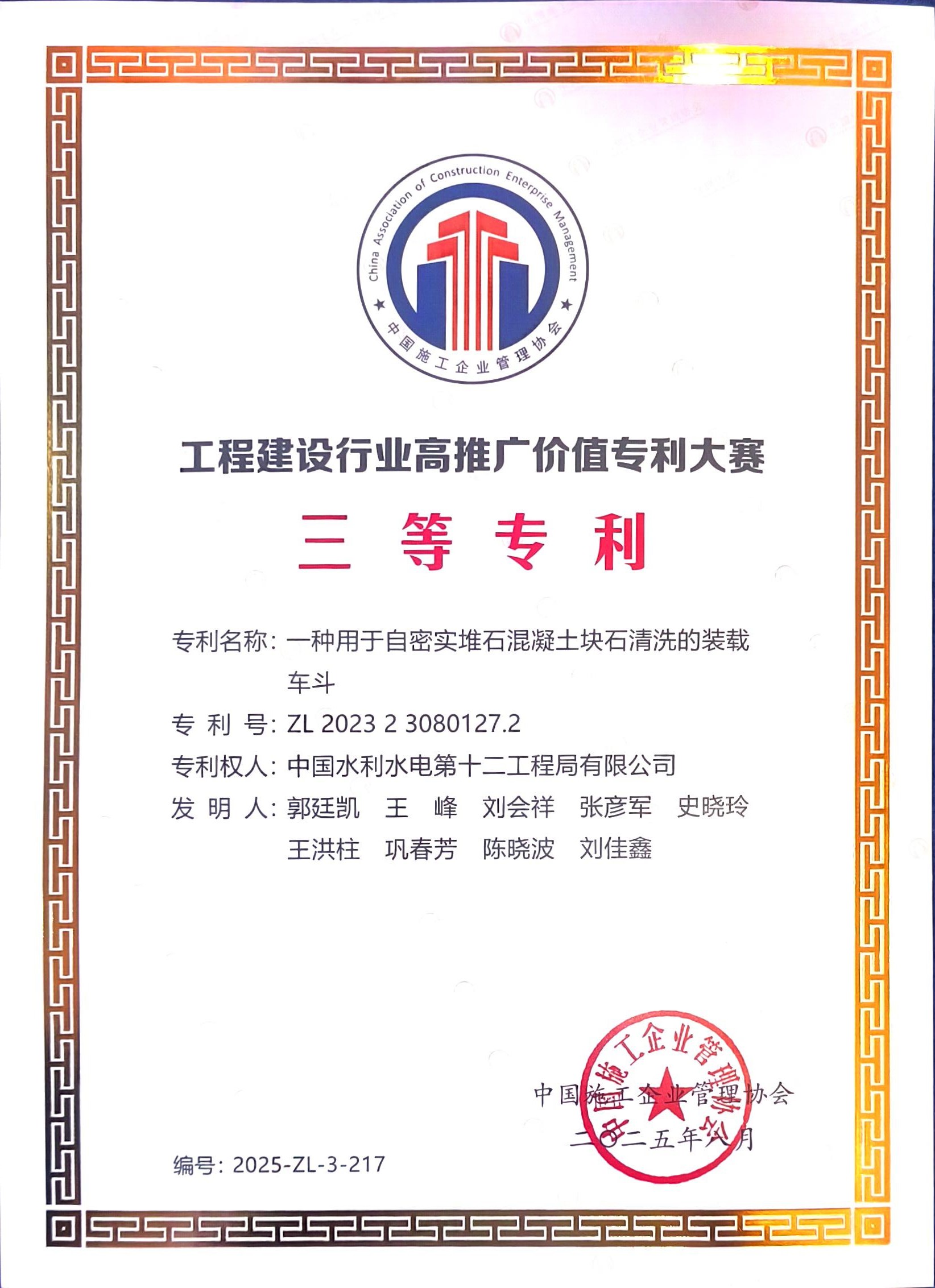 日前,公司新增一項發(fā)明專利《一種自密實堆石洗石裝置及其洗石方法》。 該發(fā)明提供了一種自密實堆石洗石裝置及其洗石方法,主要包括兩第一清洗板,兩第一清洗板相對的側(cè)壁上均轉(zhuǎn)動連接有第二清洗板,且兩第二清洗板側(cè)壁轉(zhuǎn)動連接,第一清洗板與第二清洗板內(nèi)部均開設(shè)有清洗通道,第一清洗板與第二清洗板底部均開設(shè)有出水通道,出水通道與清洗通道連通,清洗通道內(nèi)固定有用于清洗的清洗管,清洗管正對于出水通道的位置開設(shè)有若干清洗孔。 該裝置創(chuàng)新提出了可自由變形清洗平臺與多自由度智能調(diào)節(jié)機構(gòu)結(jié)合的施工現(xiàn)場嵌入式洗石技術(shù),已成功應用于東鄉(xiāng)區(qū)井山水庫大壩工程,其中該專利的部分裝置“一種用于自密實堆石混凝土塊石清洗的裝載車斗”獲得中國施工管理企業(yè)協(xié)會工程建設(shè)行業(yè)高推廣價值專利大賽三等專利,解決了傳統(tǒng)洗石裝置固定式需專用場地、卸料與清洗流程分立導致的施工效率低、資源消耗大的痛點,實現(xiàn)卸料與清洗同步化,大大提高了施工效率。